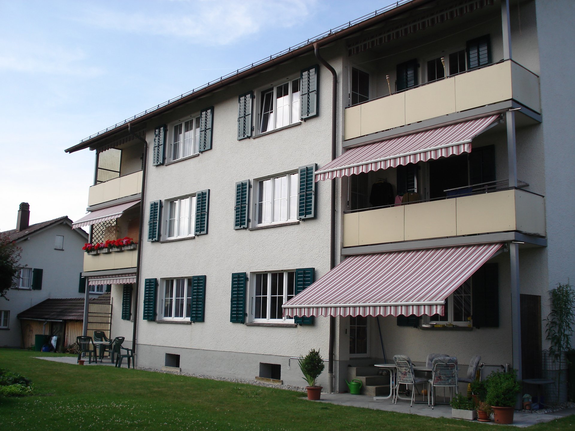 Das 6-Familienhaus wurde 1953 erstellt, es war die 12. Bauetappe unserer Genossenschaft. 1998 wurde die Liegenschaft renoviert. Im 2023 wurde die alte Oelheizung mit einer neuen Pellet-Heizung ersetzt und im 2024 sind alle Bäder saniert worden. Die Badezimmer sind nun mit ebenerdigen Duschen ausgestattet. Zu jeder Wohnung gehört ein Geräteschuppen und auf Wunsch kann ein Gemüse- oder Blumengarten bepflanzt werden.